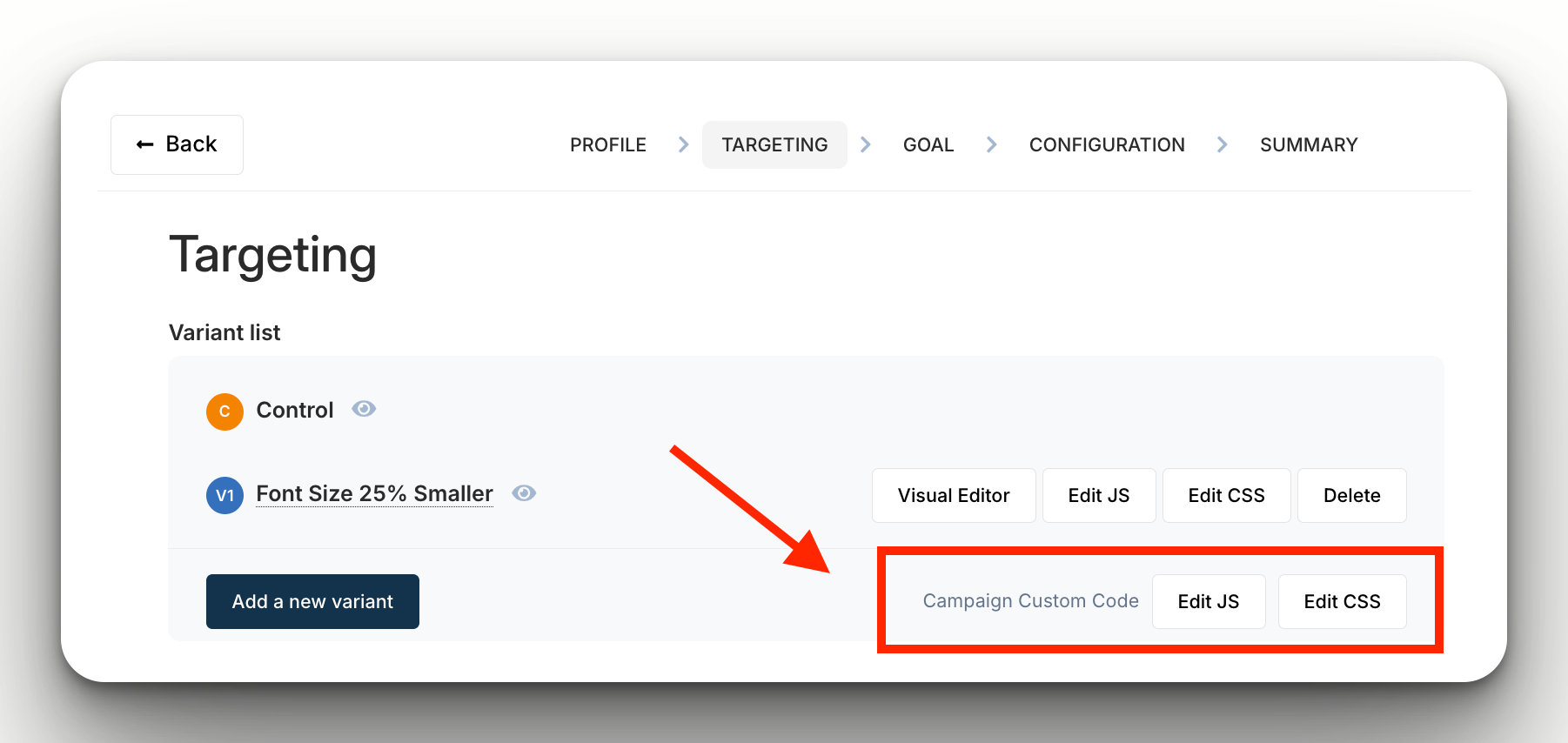 - Access Global Level Custom Code settings on the Experiment page.